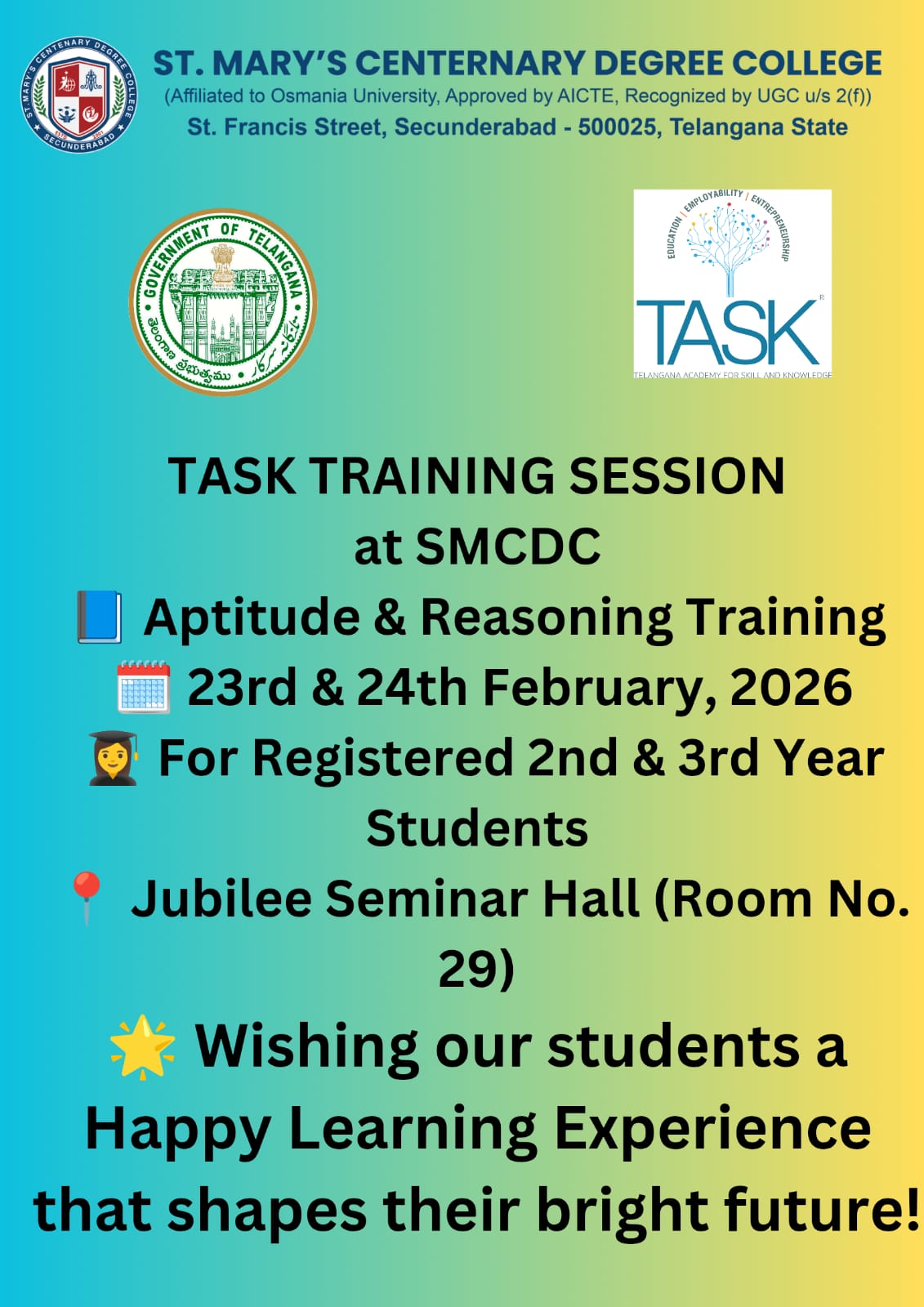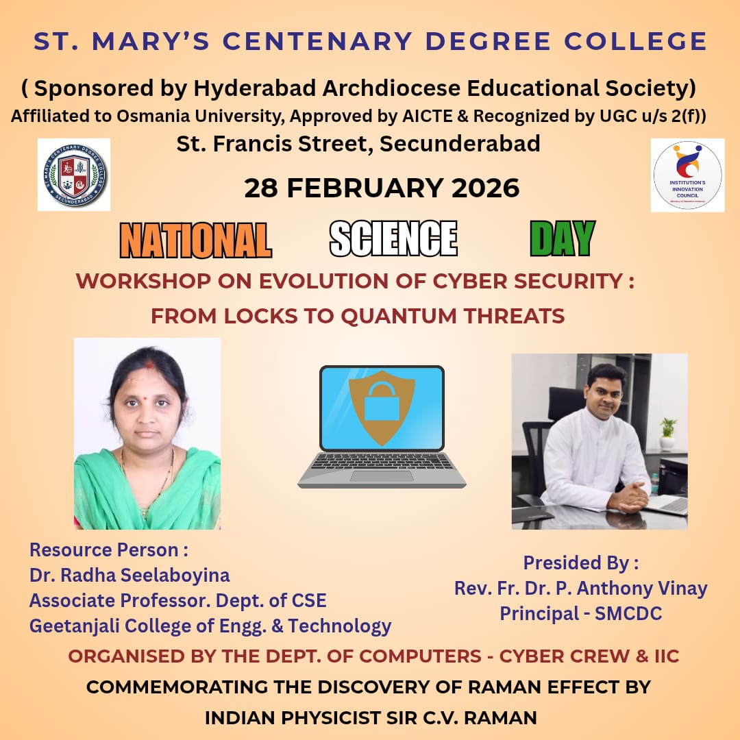 St. Mary’s Centenary Degree College is a Catholic Christian Minority Institution established in 2001 under the aegis of the Hyderabad Archdiocese Educational Society. Affiliated to Osmania University and recognized by the University Grants Commission (UGC) under Section 2(f), the college has grown into a premier center for higher education in Telangana.